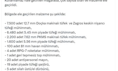 Bakanlığın sosyal medya hesabından yapılan açıklamada, “Irak kuzeyindeki Pençe-Kilit Operasyonu bölgesinde icra edilen operasyonda teröristler tarafından barınma ve saklanma maksadıyla kullanılan bir mağara daha teröristlerden temizlendi....