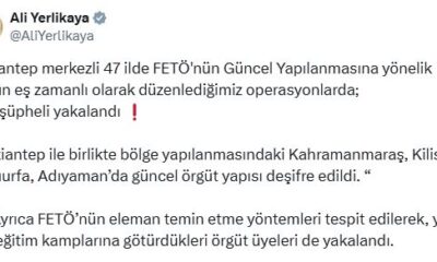 İçişleri Bakanı Ali Yerlikayanın sosyal medya hesabından yaptığı açıklamaya göre; Gaziantep Cumhuriyet Başsavcılığı ve Emniyet Genel Müdürlüğü koordinesinde, FETÖnün güncel yapılanmasına yönelik 47 ilde eş zamanlı...