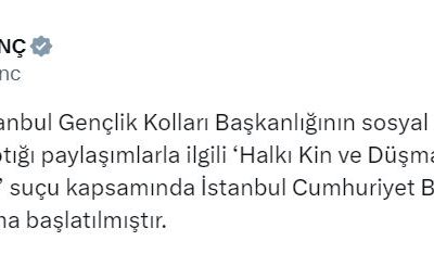 Bakan Tunç, sosyal medya hesabından yaptığı açıklamada, “Zafer Partisi İstanbul Gençlik Kolları Başkanlığının sosyal medya hesabından yaptığı paylaşımlarla ilgili Halkı kin ve düşmanlığa tahrik veya aşağılama...