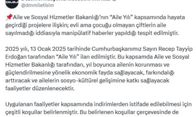 DMMnin sosyal medya hesabından yapılan açıklamada, “Aile ve Sosyal Hizmetler Bakanlığının Aile Yılı kapsamında hayata geçirdiği projelere ilişkin; evli ama çocuğu olmayan çiftlerin aile sayılmadığı iddiasıyla...