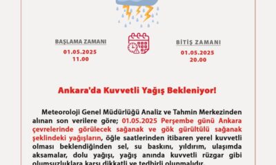 Valiliğin sosyal medya hesabından yapılan açıklamada, “Meteoroloji Genel Müdürlüğü Analiz ve Tahmin Merkezinden alınan son verilere göre; 1 Mayıs 2025 Perşembe günü Ankara çevrelerinde görülecek sağanak...