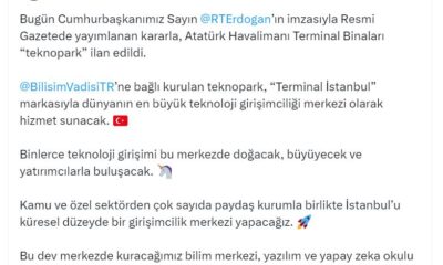 Bakan Kacır, sosyal medya hesabından yaptığı açıklamada, “Bugün Cumhurbaşkanımız Sayın Recep Tayyip Erdoğanın imzasıyla Resmi Gazetede yayımlanan kararla, Atatürk Havalimanı terminal binaları teknopark ilan edildi. Bilişim...
