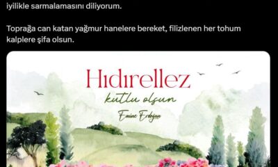 Emine Erdoğan, sosyal medya hesabından yaptığı paylaşımda, “Baharın müjdecisi Hıdırellezi kutluyor, insanlığı şefkat, merhamet ve iyilikle sarmalamasını diliyorum. Toprağa can katan yağmur hanelere bereket, filizlenen her...
