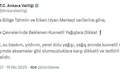 Valiliğin sosyal medya hesabından yapılan açıklamada, “Ankara Bölge Tahmin ve Erken Uyarı Merkezi verilerine göre; Ankara çevrelerinde beklenen kuvvetli yağışlara dikkat. Ani sel, su baskını, yıldırım,...
