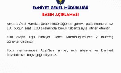 EGMden yapılan yazılı açıklamada, “Ankara Özel Harekat Şube Müdürlüğünde görevli polis memurumuz E.A. bugün saat 15.00 sıralarında beylik tabancasıyla intihar etmiştir. Elim olayla ilgili Emniyet Genel...