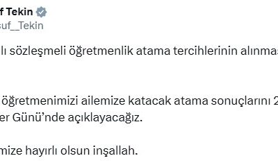 Bakan Tekin, 15 bin sözleşmeli öğretmenin atama sürecine ilişkin sosyal medya hesabından paylaşım yaptı. Tekin, “2025 yılı sözleşmeli öğretmenlik atama tercihlerinin alınması süreci başladı. 15 bin...