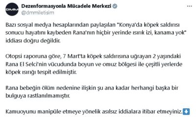DMMnin sosyal medya hesabından yapılan açıklamada, “Bazı sosyal medya hesaplarından paylaşılan Konyada köpek saldırısı sonucu hayatını kaybeden Rananın hiçbir yerinde ısırık izi, kanama yok iddiası doğru...