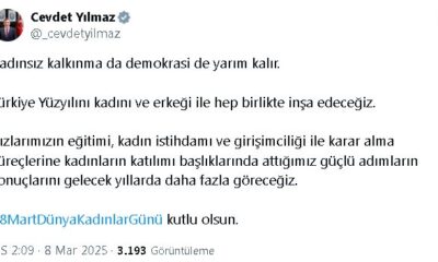 Cumhurbaşkanı Yardımcısı Cevdet Yılmaz, 8 Mart Dünya Kadınlar Günü dolayısıyla sosyal medya hesabından paylaştığı mesajında, “Kadınsız kalkınma da demokrasi de yarım kalır. Türkiye Yüzyılını kadını ve...