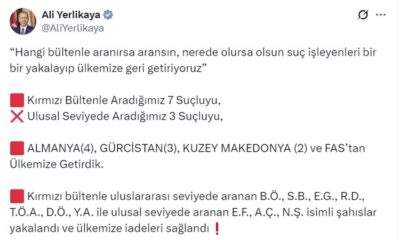Bakan Yerlikaya, sosyal medya hesabından yaptığı açıklamada, “Kırmızı bültenle uluslararası seviyede aranan B.Ö., S.B., E.G., R.D., T.Ö.A., D.Ö., Y.A. ile ulusal seviyede aranan E.F., A.Ç., N.Ş....