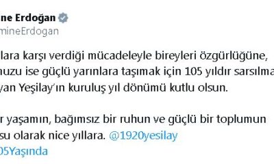 Emine Erdoğan, sosyal medya hesabından yaptığı açıklamada, “Bağımlılıklara karşı verdiği mücadeleyle bireyleri özgürlüğüne, toplumumuzu ise güçlü yarınlara taşımak için 105 yıldır sarsılmaz bir irade ortaya koyan...