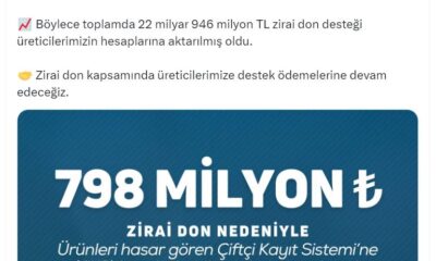 Bakan Yumaklı, sosyal medya hesabından yaptığı açıklamada, “Zirai don nedeniyle ürünleri hasar gören Çiftçi Kayıt Sistemine (ÇKS) kayıtlı olan üreticilerimize önceki ödemelerin devamı olarak 798 milyon...
