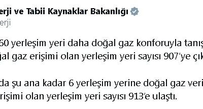 Bakanlıktan yapılan açıklamaya göre; 2024 yılında 60 yerleşim yerine daha doğal gaz iletildi. Yıl sonu itibarıyla doğal gaz bağlantısı sağlanan yerleşim yeri sayısı 907ye çıktı. 2025...