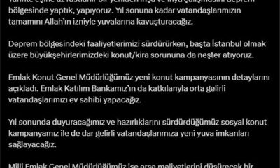 Çevre, Şehircilik ve İklim Değişikliği Bakanı Murat Kurum, Emlak Konutun Kazançlı Yatırım Kampanyası ile ilgili sosyal medya hesabından yaptığı açıklamada, deprem bölgesinde inşa ihya ve ihya...
