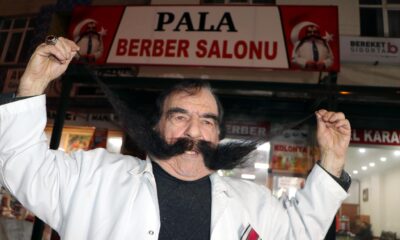 Horasanda, oğluyla birlikte berberlik yapan, 5 çocuk ve 43 torun sahibi Hacı Muhammet Kırbaç, ilçeye gelip, kendisini görenlerin dikkatini çekiyor. Kırbaç, 1 metreyi geçen bıyıklarını askerden...