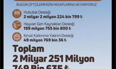 Tarım ve Orman Bakanı İbrahim Yumaklı, sosyal medya hesabından yaptığı açıklamada, 2 milyar 2 milyon 224 bin 799 TL Hububat Desteği, 199 milyon 755 bin 800...
