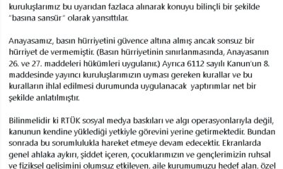 RTÜK Başkanı Ebubekir Şahin, sosyal medya hesabından yaptığı açıklamada, “RTÜK olarak dün yayıncı kuruluşlarımıza ana haber bültenleriyle ilgili kanal ismi belirtmeden genel bir uyarı yayımladık. Bazı...