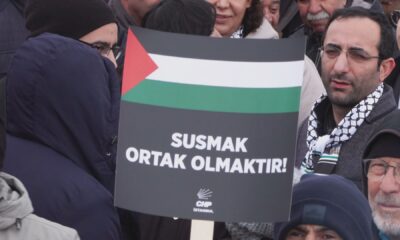 Cumhuriyet Halk Partisi üyeleri, bugün Galata Köprüsünün Eminönü ayağında Filistine destek olmak amacıyla toplandı. Üzerinde Nehirden denize, özgür Filistin, Bu yürüyüş zulme direniş ve Susmak ortak...