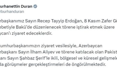 İletişim Başkanı Burhanettin Duran, sosyal medya hesabından yaptığı açıklamada, “Cumhurbaşkanımız Sayın Recep Tayyip Erdoğan, 8 Kasım Zafer Günü münasebetiyle Baküde düzenlenecek törene iştirak etmek üzere Azerbaycanı...