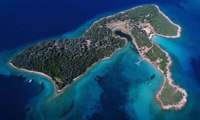 MUĞLAnın Gökova Körfezindeki, koruma altında olan altın sarısı renkli kumuyla ünlü Sedir Adası, dronla havadan görüntülendi. Mısır Kraliçesi Kleopatra ile Romalı sevgilisi komutan Antoniusun büyük aşk...