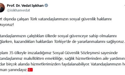 Bakanı Işıkhan, sosyal medya hesabından yaptığı açıklamada, yurt dışında çalışan Türk vatandaşlarının sosyal güvenlik haklarını koruduklarını belirterek, “Vatandaşlarımızın çalıştıkları ülkede sosyal güvenceye sahip olmalarını sağlarken, kazandıkları...