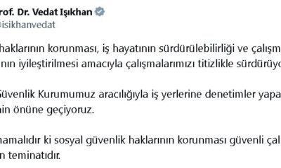 Bakan Vedat Işıkhan, sosyal medya hesabından yaptığı açıklamada, “Çalışan haklarının korunması, iş hayatının sürdürülebilirliği ve çalışma koşullarının iyileştirilmesi amacıyla çalışmalarımızı titizlikle sürdürüyoruz. Sosyal Güvenlik Kurumumuz aracılığıyla...