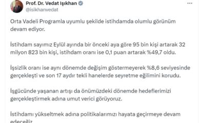 Bakan Işıkhan, sosyal medya hesabından yaptığı açıklamada, eylül ayına ilişkin işgücü istatistiklerini değerlendirdi. Işıkhan, “Orta Vadeli Programla uyumlu şekilde istihdamda olumlu görünüm devam ediyor. İstihdam sayımız...