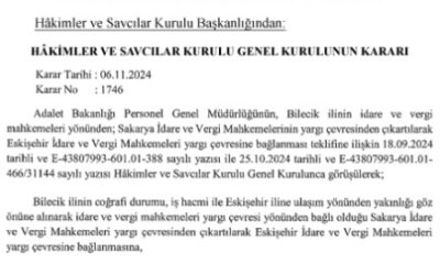 Resmi Gazete’de yayımlanan Hakimler ve Savcılar Kurulu kararında; Bilecik ilinin coğrafi durumu, iş hacmi ile Eskişehir iline yakınlığı göz önüne alınarak idare ve vergi mahkemeleri yargı...