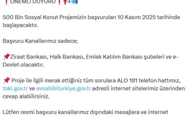 Bakanlığın sosyal medya hesabından yapılan açıklamada, “500 bin sosyal konut projemizin başvuruları 10 Kasım 2025 tarihinde başlayacaktır. Başvuru kanallarımız sadece; Ziraat Bankası, Halk Bankası, Emlak Katılım...