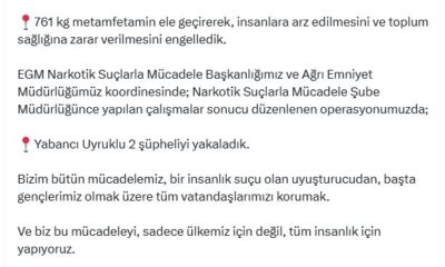 İçişleri Bakanı Yerlikaya: Ağrıda 761 kilogram metamfetamin ele geçirerek, insanlara arz edilmesini ve toplum sağlığına zarar verilmesini engelledik. Yabancı uyruklu 2 şüpheliyi yakaladık.