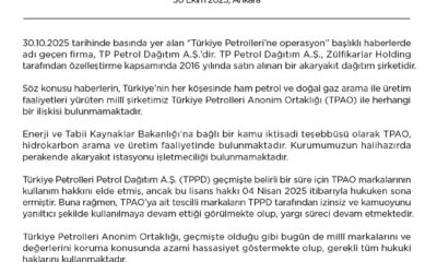 TPAOnun sosyal medya hesabından yapılan açıklamada, “30 Ekim 2025 tarihinde basında yer alan Türkiye Petrolleri’ne operasyon başlıklı haberlerde adı geçen firma, TP Petrol Dağıtım A.Ş.dir. TP...