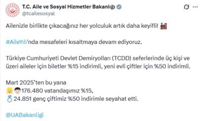 Bakanlığın sosyal medya hesabından yapılan açıklamada, “Ailenizle birlikte çıkacağınız her yolculuk artık daha keyifli. Aile Yılında mesafeleri kısaltmaya devam ediyoruz. Türkiye Cumhuriyeti Devlet Demiryolları (TCDD) seferlerinde...