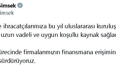 Bakan Şimşek, sosyal medya hesabından yaptığı açıklamada, “KOBİlerimize ve ihracatçılarımıza bu yıl uluslararası kuruluşlardan yaklaşık 2,3 milyar dolar uzun vadeli ve uygun koşullu kaynak sağladık. Dezenflasyon...