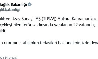 Sağlık Bakanlığının sosyal medya hesabından yapılan açıklamada, “TUSAŞ Ankara Kahramankazan tesislerine yönelik gerçekleştirilen terör saldırısında yaralanan 22 vatandaşımızdan 15i taburcu edildi. 7 yaralımızın durumu stabil olup...