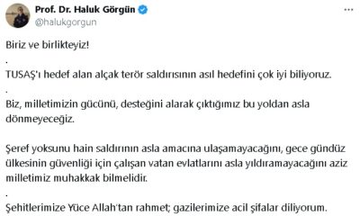 Haluk Görgün, sosyal medya hesabı üzerinden yaptığı açıklamada, “Biriz ve birlikteyiz. TUSAŞı hedef alan alçak terör saldırısının asıl hedefini çok iyi biliyoruz. Biz, milletimizin gücünü, desteğini...