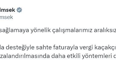Bakan Şimşek, sosyal medya hesabından yaptığı açıklamada, “Vergide adaleti sağlamaya yönelik çalışmalarımız aralıksız devam ediyor. Yapay zekanın da desteğiyle sahte faturayla vergi kaçakçılığı yapanların tespitinde ve...