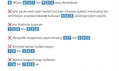 Bakan Yerlikaya, sosyal medya hesabından yaptığı açıklamada, “Emniyet ve jandarma trafik ekiplerimizce 5-12 Eylül 2024 tarihleri arasında 2 milyon 667 bin 955 araç denetlendi. Işıklı ya...