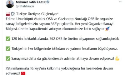 Sanayi ve Teknoloji Bakanlığı tarafından 2 yeni OSBye daha sicil verilerek tüzel kişilik kazandırıldı. Toplam OSB sayısı, 362ye yükseldi. Yeni kurulan 100 hektar büyüklüğündeki Edirne Uzunköprü...