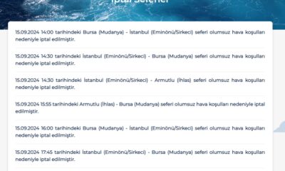 Bursa Deniz Otobüsleri, olumsuz hava koşulları nedeniyle bugün yapılacak olan 6 seferini iptal etti. BUDOdan yapılan duyuruda, 14.00 ile 17.45 saatleri arasında yapılması planlanan Bursa (Mudanya)-İstanbul...