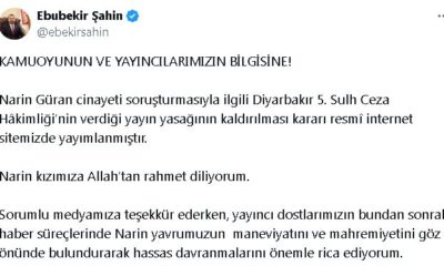 RTÜK Başkanı Şahin, sosyal medya hesabından yaptığı açıklamada, “Narin Güran cinayeti soruşturmasıyla ilgili Diyarbakır 5inci Sulh Ceza Hakimliğinin verdiği yayın yasağının kaldırılması kararı resmi internet sitemizde...