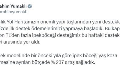 Bakan Yumaklı, sosyal medya hesabından yaptığı açıklamada, “Hayvancılık yol haritamızın önemli yapı taşlarından yeni destekleme modelimizde ilk destek ödemelerimizi yapmaya başladık. Bu kapsamdaki 100 milyon TLden...
