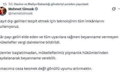 Hazine ve Maliye Bakanı Mehmet Şimşek, kayıt dışı ekonomiyle mücadele çalışmalarına ilişkin sosyal medya hesabından açıklama yaptı. Bakan Şimşek, “Kayıt dışı gelirleri tespit etmek için teknolojinin...
