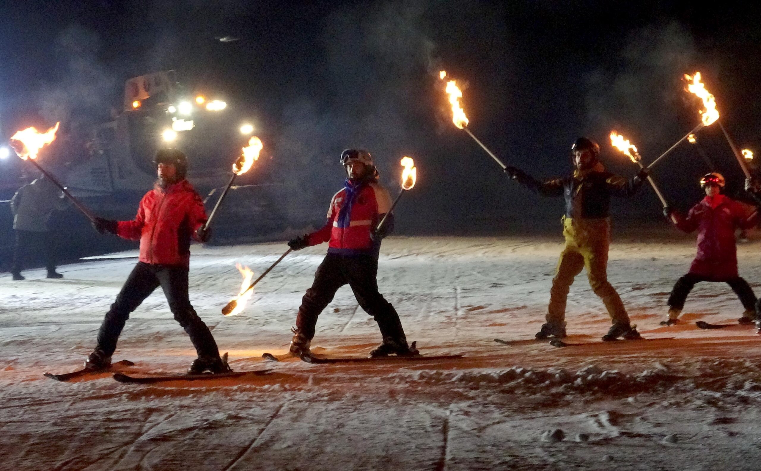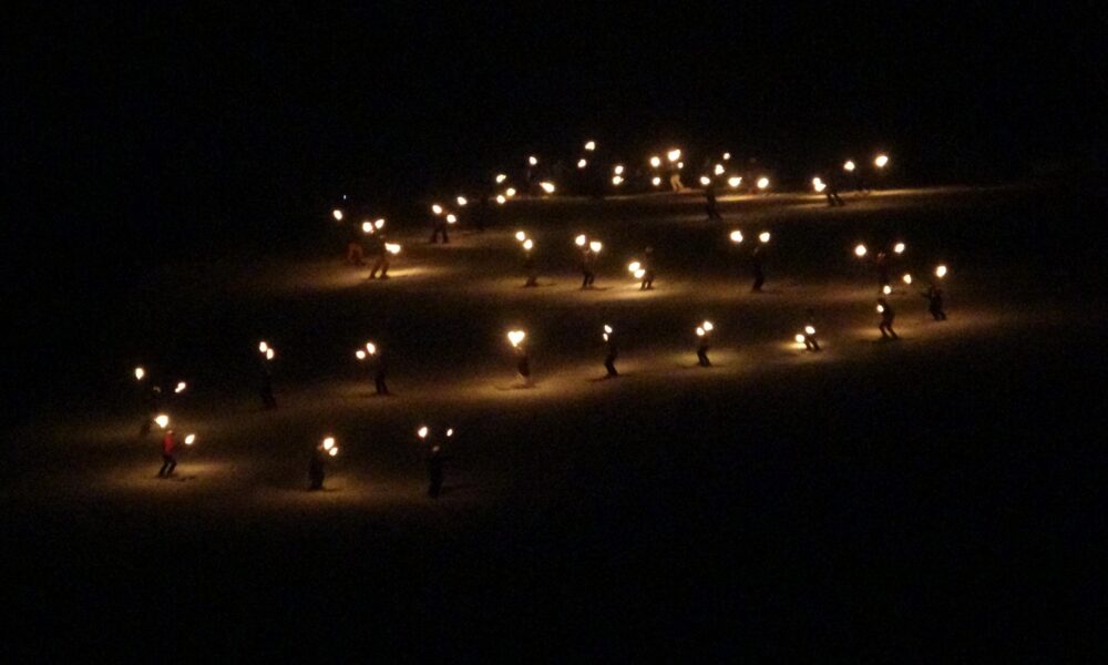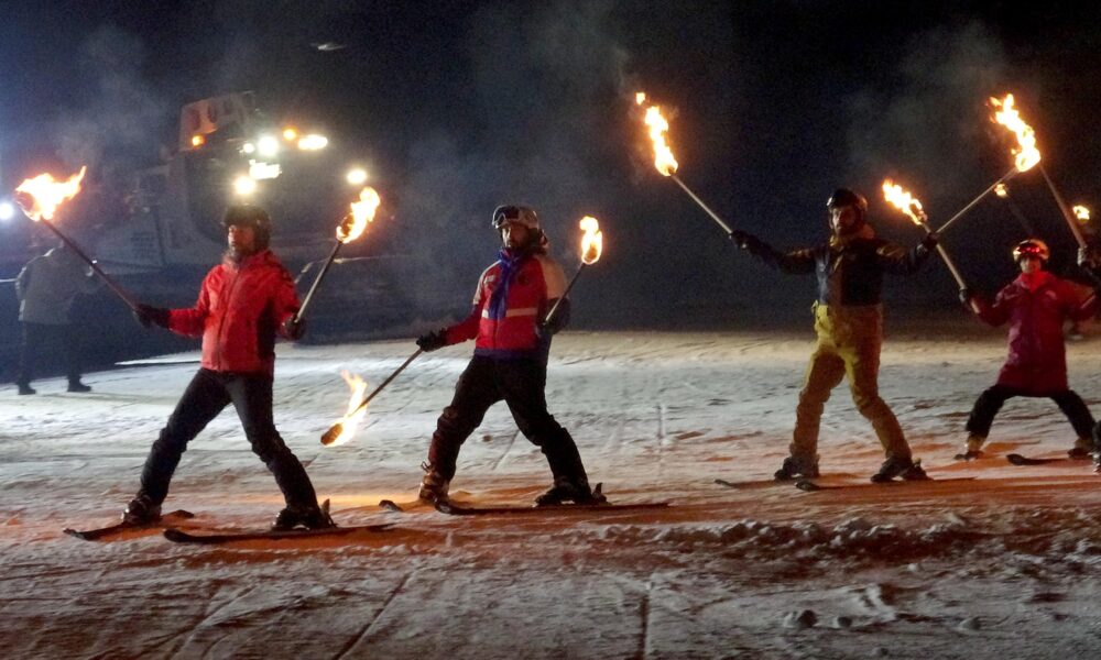Palandöken Kayak Merkezi'nde, aydınlatılmış pistlerinde meşaleli kayak, ledli adamlar, lazer, kar motoru gösterisiyle sezon açılışı gerçekleştirildi. Fotoğraf: Oktay POLAT / Erzurum (DHA)