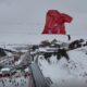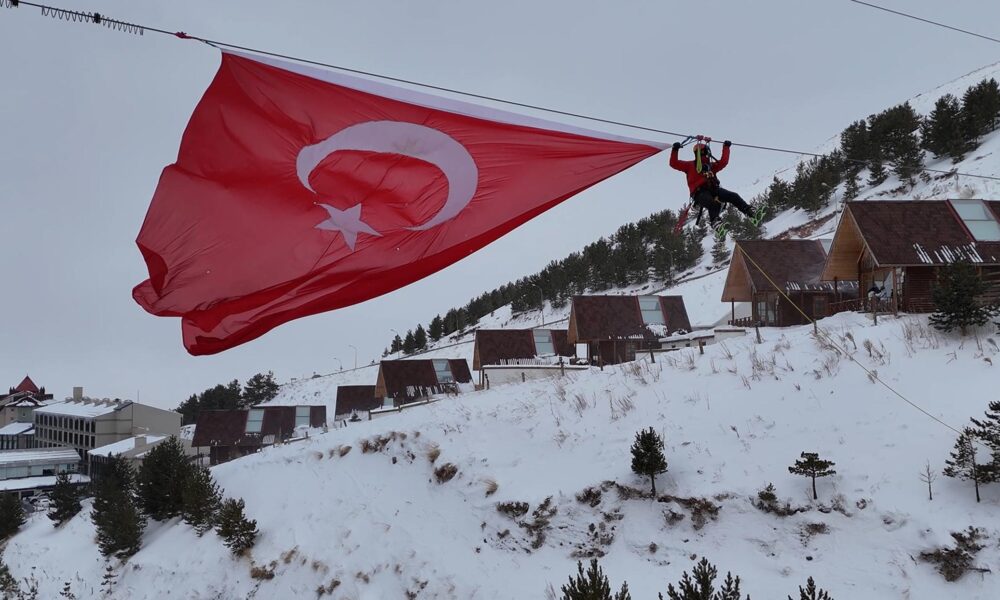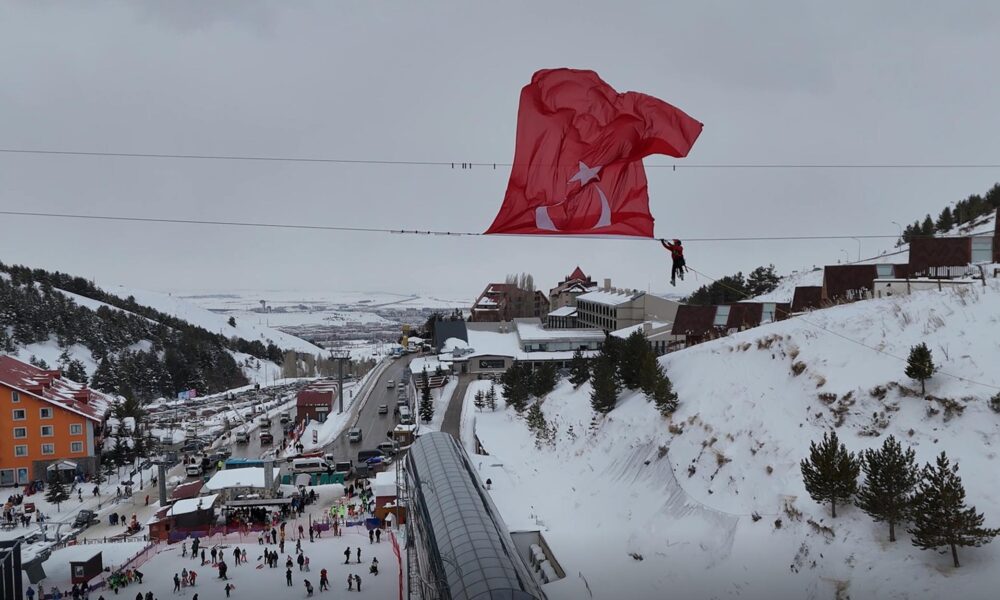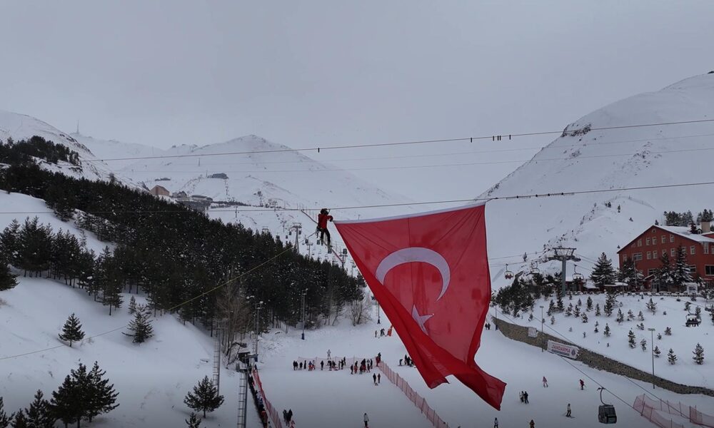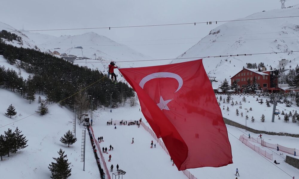 Palandöken’deki zipline hattına dev Türk bayrağı astılar