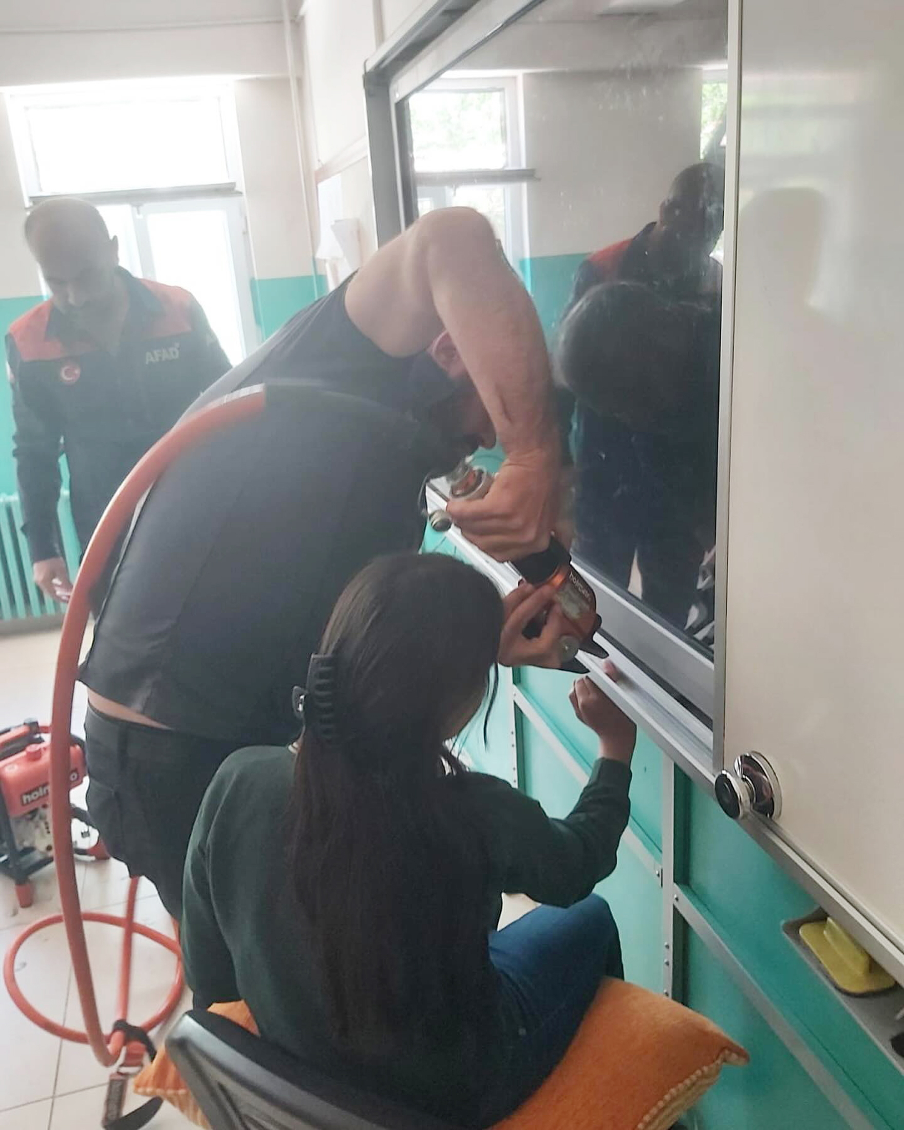 Merkeze bağlı Halıcılar köyünde 6ncı sınıf öğrencisi E.T., öğle arasında oynarken, parmağını akıllı tahtanın alt tarafında bulunan sac malzemenin deliğine sıkıştırdı. Öğrencinin parmağı çıkarılamayınca AFAD ekibine haber verildi. Gelen AFAD ekibi, sacı keserek E.T.nin parmağını kurtardı. E.T.nin sağlık durumunun iyi olduğu öğrenildi.