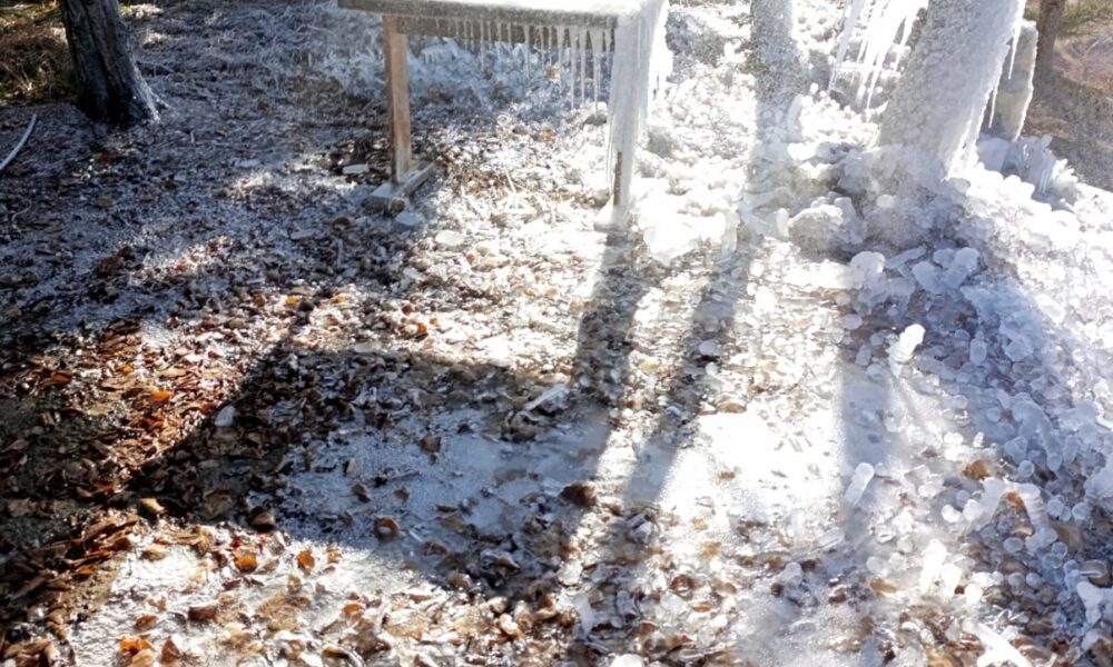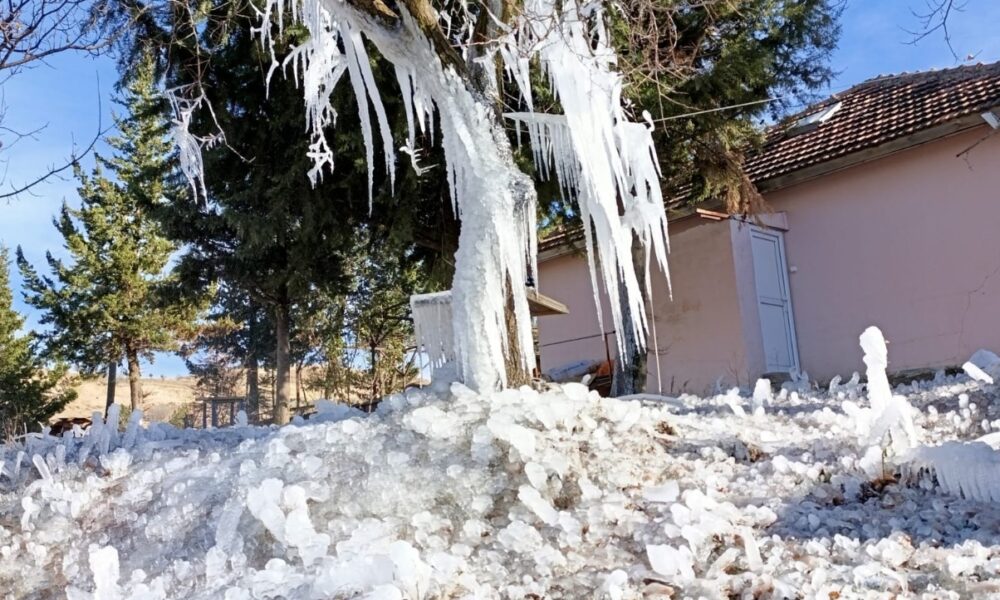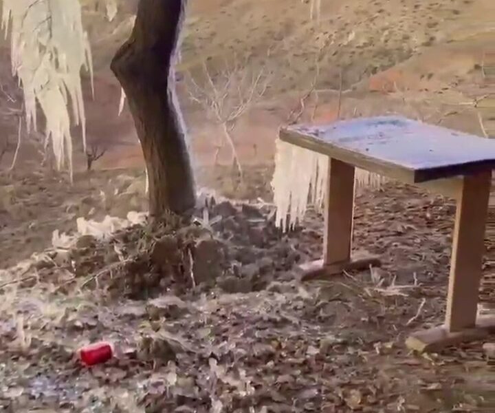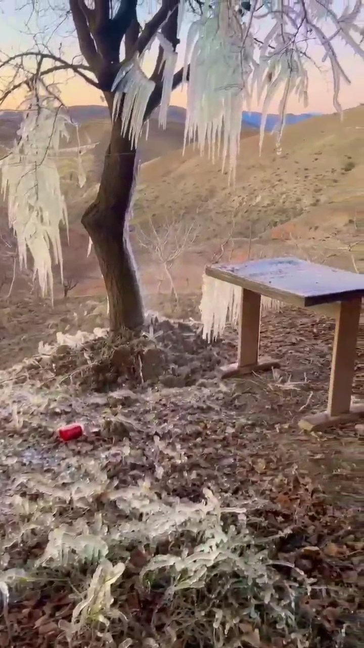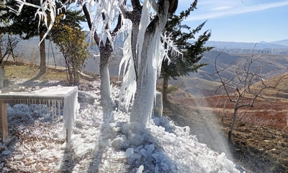 Hava sıcaklığının mevsim normallerinin altında seyrettiği Siirt’te, kent merkezindeki bir üzüm bağında bulunan ağaca, patlayan borudan su sıçradı. Sıcaklığın gece sıfırın altında 5 dereceye kadar düştüğü havada, ağaçta buz sarkıtları oluştu. O anlar, üzüm bağının sahibi Mami Çelik tarafından cep telefonuyla kayda alındı.