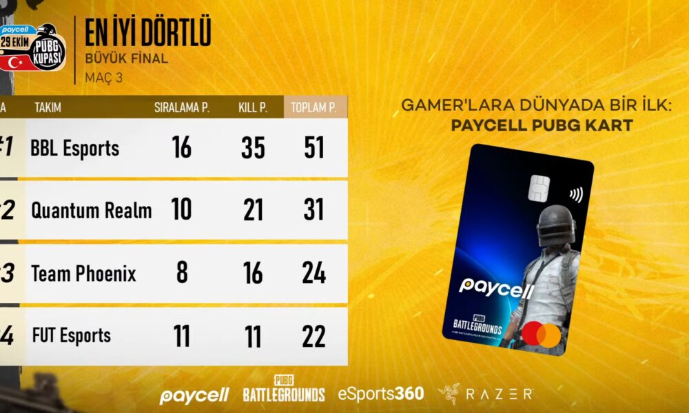 Özel davetli takımların da mücadele ettiği Paycell 29 Ekim PUBG Kupasının finali canlı olarak resmi PUBG Türkiye, Kick, Twitch ve YouTube kanallarından yayınlandı. Projenin ana ortağı eSports360 ve destek sponsoru Razerın katkılarıyla gerçekleşen turnuvada finali Utku Utimikk Taşyürek, Timur Timurlengx Günay ve Arda Tropik Bayram sundu.