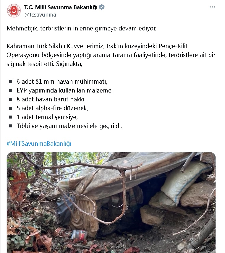 Bakanlığının sosyal medya hesabından yapılan açıklamada, “Mehmetçik, teröristlerin inlerine girmeye devam ediyor. Kahraman Türk Silahlı Kuvvetlerimiz, Irakın kuzeyindeki Pençe-Kilit Operasyonu bölgesinde yaptığı arama-tarama faaliyetinde, teröristlere ait bir sığınak tespit etti. Sığınakta; 6 adet 81 mm havan mühimmatı, ey yapımı patlayıcı (EYP) yapımında kullanılan malzeme, 8 adet havan barut hakkı, 5 adet alpha-fire düzenek, 1 adet termal şemsiye, tıbbi ve yaşam malzemesi ele geçirildi” denildi.