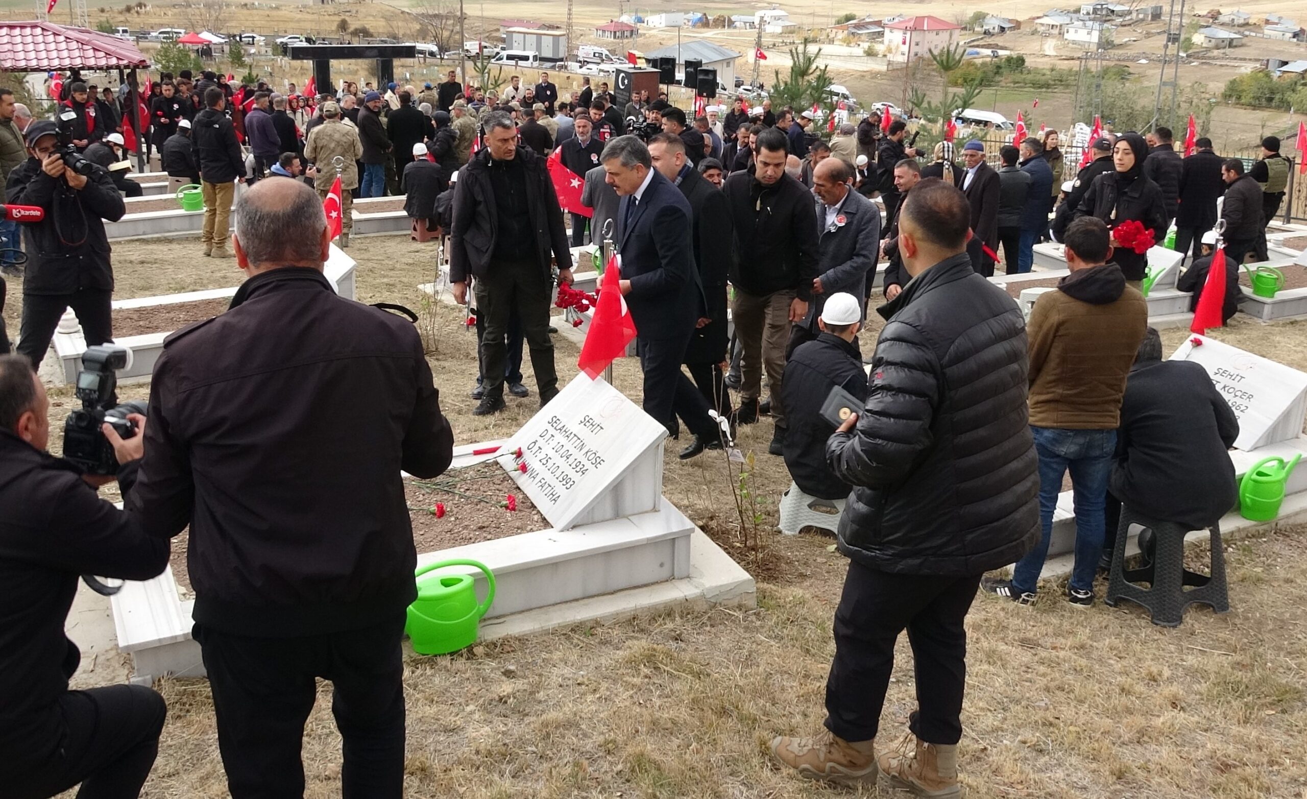 • Erzurum Valisi Mustafa Çiftçi (fotoğrafta solda), şehit mezarlarına kırmızı karanfil bırakıp yakınlarına başsağlığı dileklerinde bulundu. Fotoğraf: Oktay POLAT / Erzurum, (DHA)