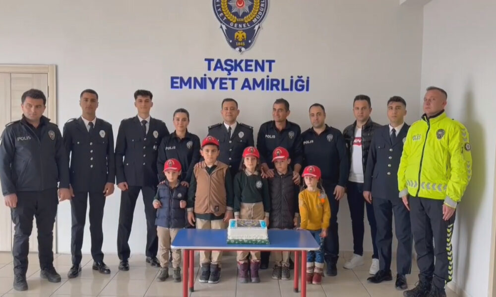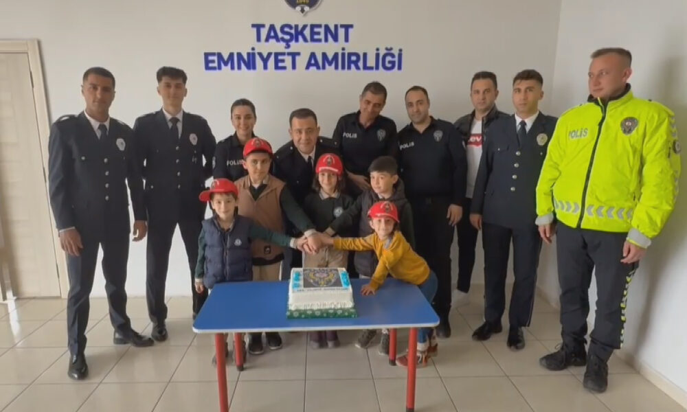 Taşkent ilçesi Muzaffer Özlen İlköğretim Okulu’nda eğitim gören ve hayali polis olmak olan 5 öğrenci, Türk Polis Teşkilatı’nın kuruluşunun 180’inci yılı nedeniyle Taşkent ilçe Emniyet Amirliği’ni ziyaret edip, emniyet personelini kutladı. Ziyarette görevli memurlara şiir okuyan çocuklar, 1 günlüğüne polislik yaptı. Polis memurları gibi gelen ihbarları telsizle ekiplere ileten çocuklar, ekip araçlarına binerek polisliği deneyimledi. Ziyaret sonrası İlçe Emniyet Amiri Murat Düz, çocuklara polis şapkası hediye etti.