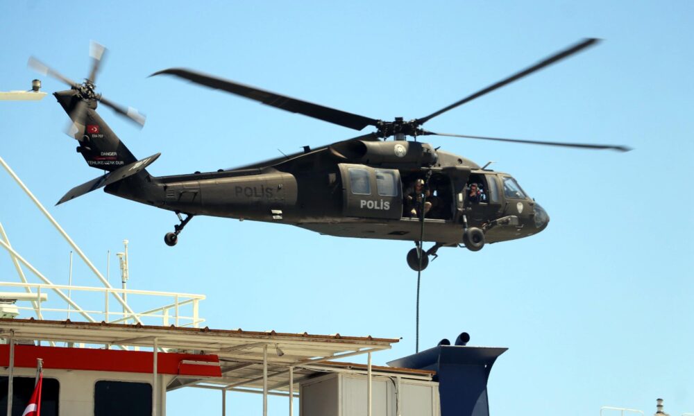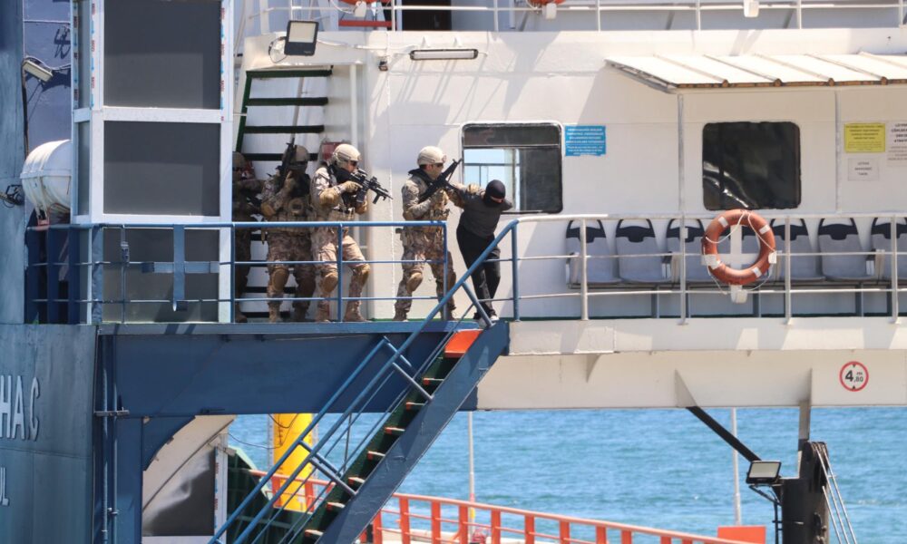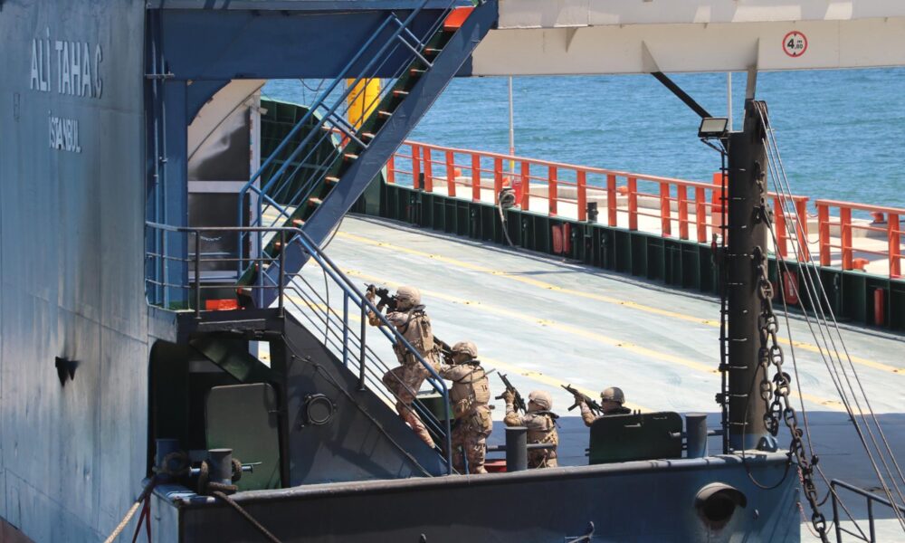 • Tekirdağ'da polis, uyuşturucu sevkiyatı yapılan 2 gemiye yönelik tatbikat gerçekleştirdi. Senaryo gereği 2 gemiye havadan, karadan ve denizden eş zamanlı operasyon düzenlendi; 2 şüpheli yakalandı. Fotoğraf: Tekirdağ, (DHA)